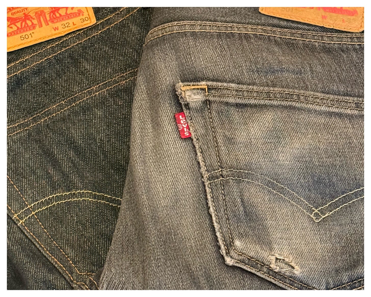 First, before you induce the shrinkage by soaking or washing them, wear as you would regular 501s but slightly oversized and optimized for darker, more monochrome color palettes where blue doesn’t work as well—think white OCBD, gray tie, gray cardigan, gray herringbone tweed sport coat.